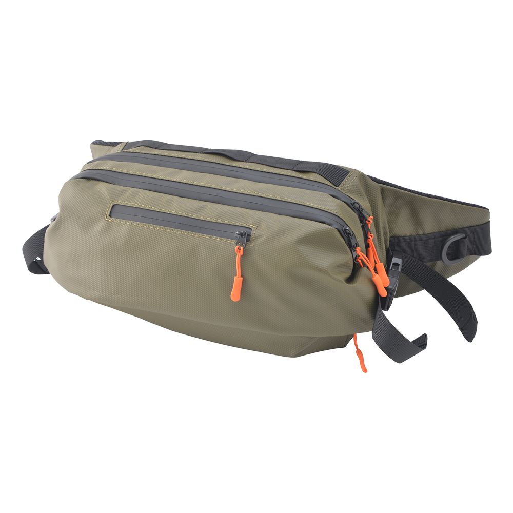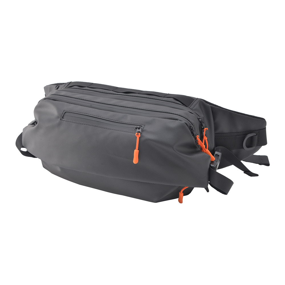 多機能でたくさんのポケットがついたウエストバッグ。 折り畳み傘、スマートフォン、財布、タオル、イヤホンなどを収納することができます。 フロントの広々としたスペースには靴や服などの大きめのアイテムが収納できます。 内装は荷物が見やすいオレンジ色を採用。 ターポリン生地を使った耐久性、撥水性に優れたバッグです。
